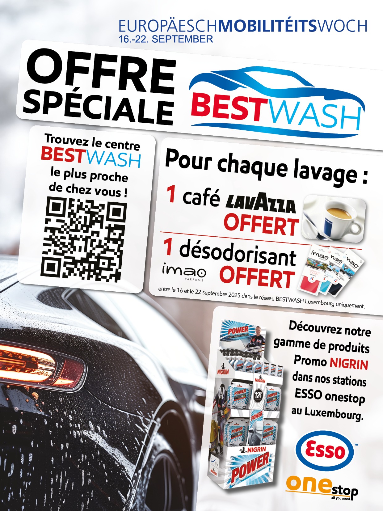BESTCHARGE et BESTWASH gâtent leurs clients pendant la semaine européenne de la mobilité du 16 au 22 septembre : tarifs réduits sur la recharge électrique, boissons chaudes offertes et cadeaux pratiques pour la route. L’occasion idéale de découvrir deux services conçus pour simplifier vos déplacements et soigner votre véhicule.